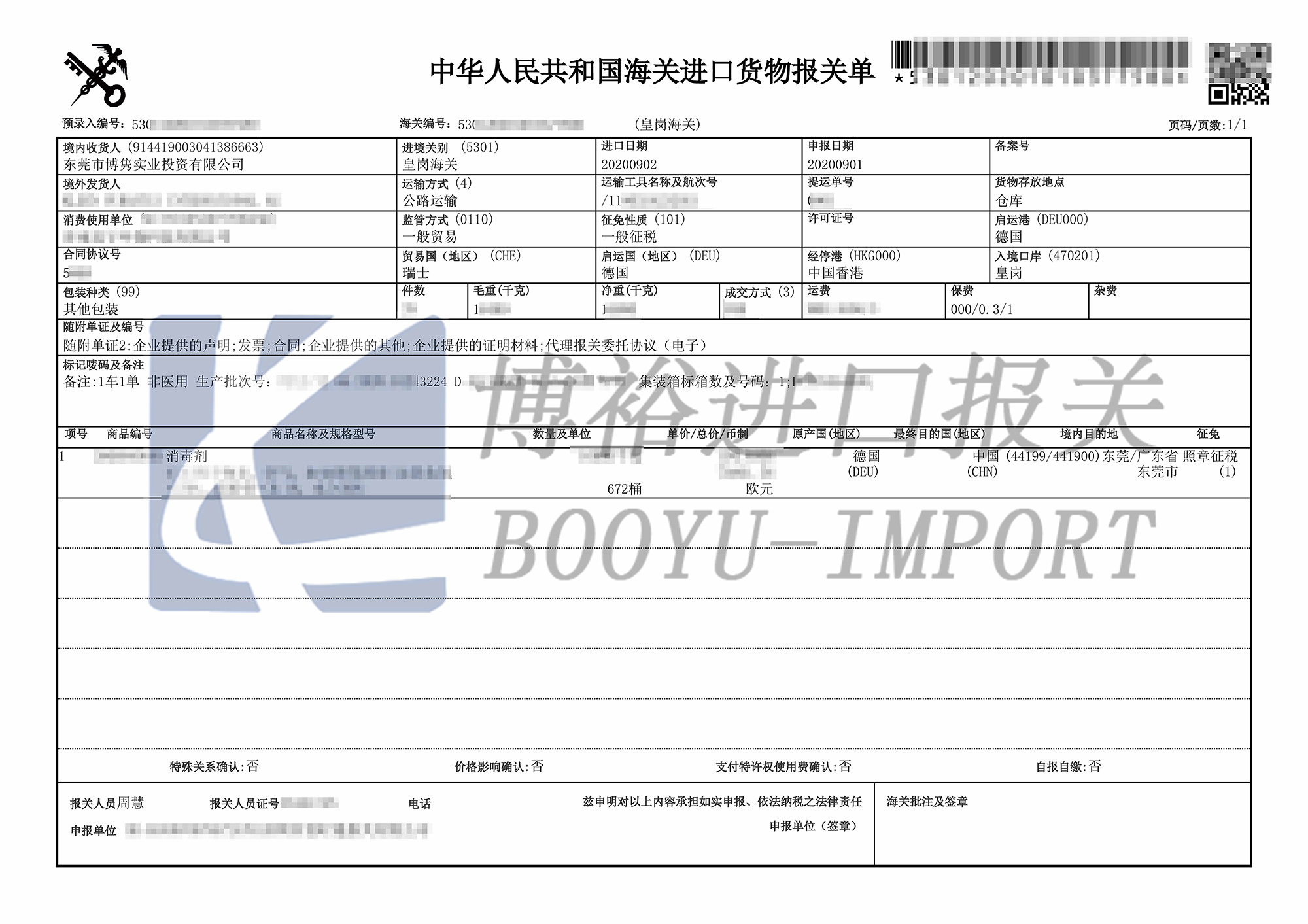 消毒劑進口企業(yè)的進出口經(jīng)營權(quán)、消毒劑原產(chǎn)地證書、消毒劑的中文成分表、MSDS中文報告、裝箱單合同等、產(chǎn)品信息:品名、數(shù)量、包裝、重量及體積等。